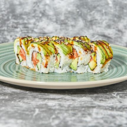 Premium top kaburamaki sushi roll with salmon, avocado, cucumber, wasabi mayo dressing, rolled inside seaweed wrap, topped with avocado, sesame,