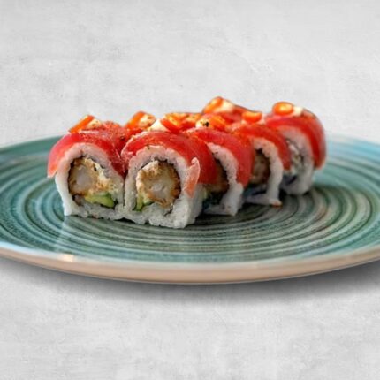 Premium kaburamaki – top sushi roll with tuna, avocado, cucumber, spicy mayo, rolled inside seaweed wrap, topped with tuna, spicy